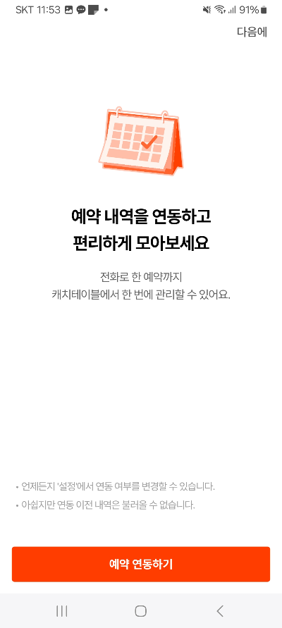 연동하기(전화예약도 앱 확인 가능한 기능) 혹은 상단에 있는 다음에 누르기 - 이후 선택가능한 기능