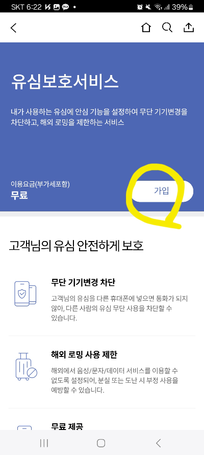 유심보호 서비스를 가입합니다. 기기변경이 안되고 해외에서 핸드폰을 사용할 수 없는 서비습니다. 가입비는 무료이며 국번 없이 114 고객센터, T월드 앱, SK텔레콤 대리점에서 신청할 수 있습니다.